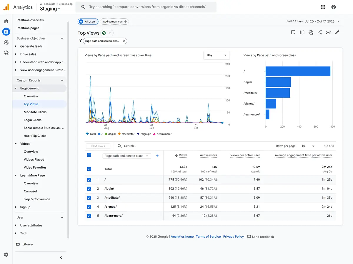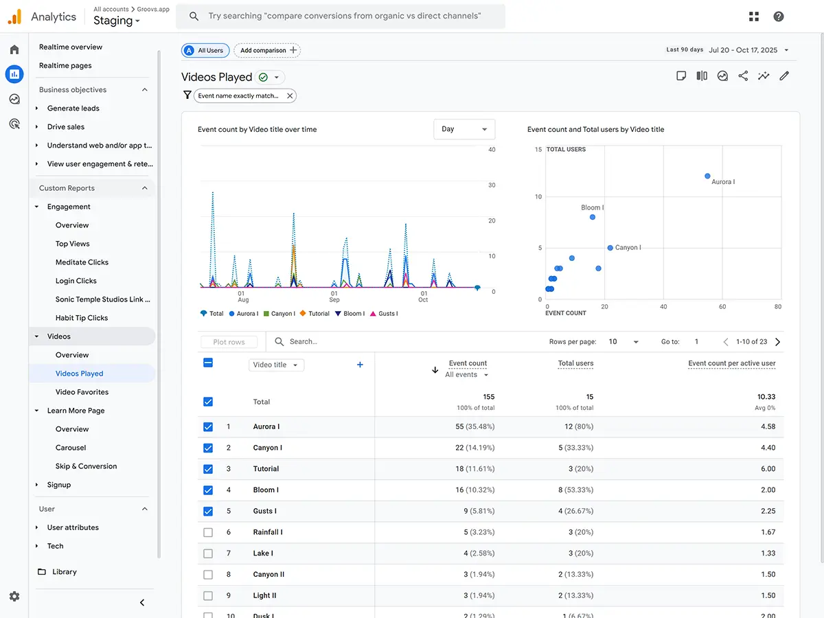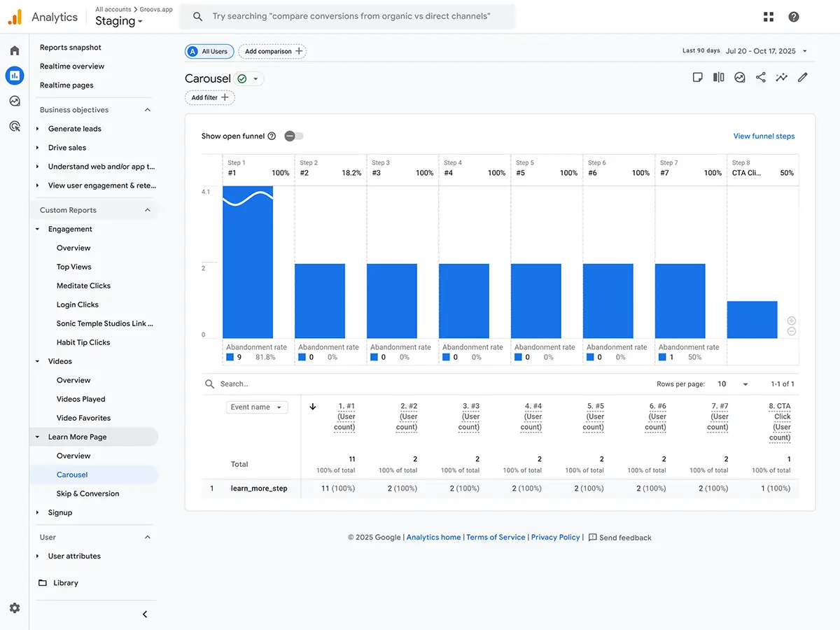 Sonic Temple Studios is a platform that helps users enhance their mindfulness through meditation and music-based video content. The client wanted to improve their website to provide a more engaging and personalized experience for their subscribers. Their goal was to create a Meditate page that allowed users to access a curated library of videos called “Groovs,” track their progress, and stay motivated through activity streaks. They also wanted a data-driven setup to monitor user engagement, video performance, and conversion funnels, along with automated email campaigns to re-engage users based on their activity. The existing setup needed a custom video player, deeper analytics integration, and automation between the website and GetResponse for personalized user communication.